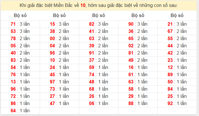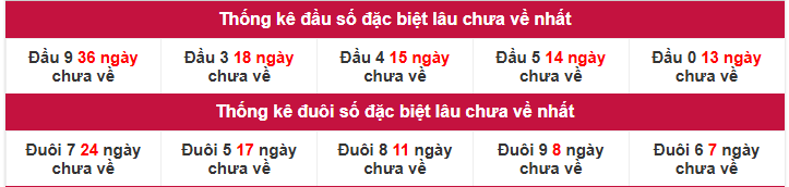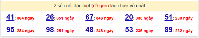 - Thống kê 2 số cuối giải đặc biệt lâu chưa xuất hiện nhất: 10 (561 lần), 41 (364 lần), 26 (351 lần), 67 (346 lần), 20 (333 lần)