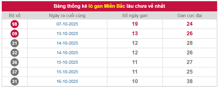 - Lô gan miền Bắc lâu chưa xuất hiện: 98 - 09 - 21 - 32 - 36 - 37