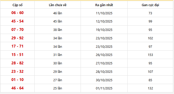 ⭐️ Cặp lô khan XSMB ít về nhất: 06 - 60 (46 lần), 45 - 54 (45 lần), 07 - 70 (38 lần), 29 - 92 (34 lần), 17 - 71 (34 lần)