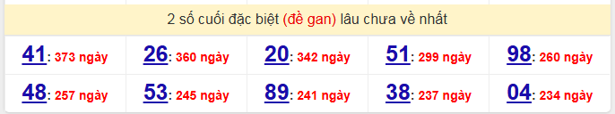 - Thống kê 2 số cuối giải đặc biệt lâu chưa xuất hiện nhất: 41 (373 lần), 26 (360 lần), 20 (342 lần), 51 (299 lần), 98 (260 lần)