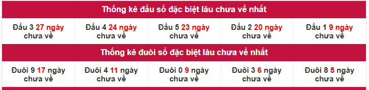 - Thống kê đầu giải đặc biệt MB lâu chưa ra: Đầu 3: 27 ngày, Đầu 4: 24 ngày, Đầu 5: 23 ngày, Đầu 2: 20 ngày, Đầu 1: 9 ngày