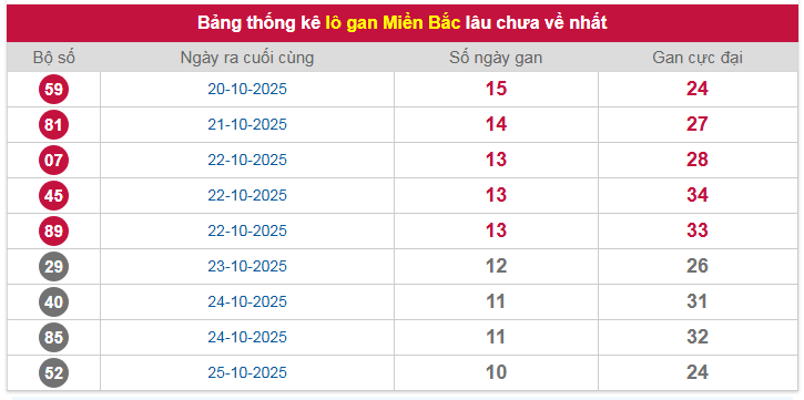- Lô gan miền Bắc lâu chưa xuất hiện: 59 - 81 - 07 - 45 - 89