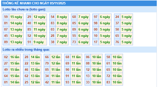 Sau đây là phần phân tích chi tiết những con số có khả năng xuất hiện cao trong kỳ Xổ số Miền Bắc ngày 5/11/2025, được tổng hợp dựa trên dữ liệu thống kê lô tô của các ngày gần đây. Những con số này được chọn lọc từ quy luật xuất hiện và chu kỳ thống kê mới nhất, nhằm mang đến cho người chơi nguồn tham khảo hữu ích.