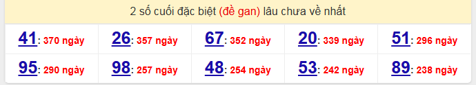 - Thống kê 2 số cuối giải đặc biệt lâu chưa xuất hiện nhất: 41 (370 lần), 26 (357 lần), 67 (352 lần), 20 (339 lần), 51 (296 lần)