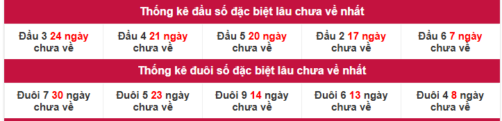 - Thống kê đuôi giải đặc biệt MB lâu chưa ra: Đuôi 7: 30 ngày, Đuôi 5: 23 ngày, Đuôi 9: 14 ngày, Đuôi 6: 13 ngày, Đuôi 1: 11 ngày
