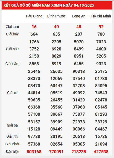 Hôm nay 13:42 - Xem(65)Thống kê XSMN ngày 11/10/2025 – Cập nhật kết quả xổ số miền Nam hôm nay với đầy đủ thông tin về tần suất lô gan, cặp lô tô gan, giải đặc biệt cùng kết quả lô tô 2 số, lô VIP và các con số có tần suất xuất hiện cao trong ngày hôm nay và ngày mai, được tổng hợp chi tiết tại chuyên trang của chúng tôi.