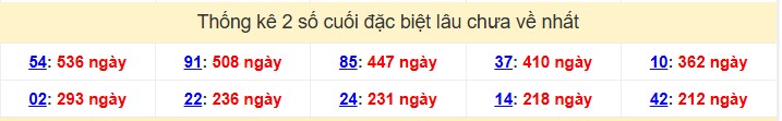 - Thống kê 2 số cuối giải đặc biệt lâu chưa xuất hiện nhất: 54 (536 lần), 91 (508 lần), 85 (447 lần), 37 (410 lần), 10 (362 lần).