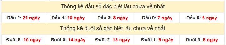 - Thống kê đầu giải đặc biệt MB lâu chưa ra: Đầu 2: 21 ngày, Đầu 1: 10 ngày, Đầu 3: 8 ngày, Đầu 9: 7 ngày, Đầu 0: 6 ngày.