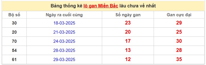 - Lô gan miền Bắc lâu chưa xuất hiện: 30 - 20 - 70 - 54 - 61