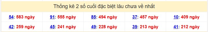 - Thống kê 2 số cuối giải đặc biệt lâu chưa xuất hiện nhất: 54 (583 lần), 91 (555 lần), 85 (494 lần), 37 (457 lần), 10 (409 lần).