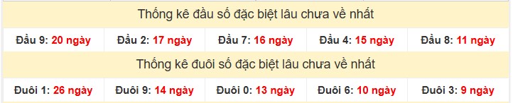 - Thống kê đuôi giải đặc biệt MB lâu chưa ra: Đuôi 1: 26 ngày, Đuôi 9: 14 ngày, Đuôi 0: 13 ngày, Đuôi 6: 10 ngày, Đuôi 3: 9 ngày