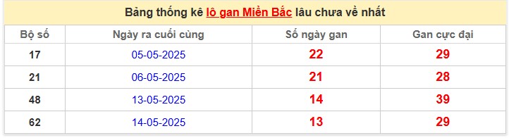 - Lô gan miền Bắc lâu chưa xuất hiện: 17 - 21 - 48 - 62