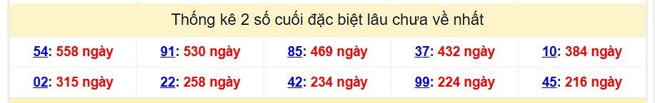 - Thống kê 2 số cuối giải đặc biệt lâu chưa xuất hiện nhất: 54 (558 lần), 91 (530 lần), 85 (469 lần), 37 (432 lần), 10 (384 lần).