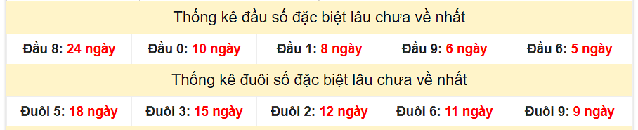 - Thống kê đầu giải đặc biệt MB lâu chưa ra: Đầu 8: 24 ngày, Đầu 0: 10 ngày, Đầu 2: 9 ngày, Đầu 1: 8 ngày, Đầu 9: 6 ngày