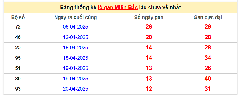 - Lô gan miền Bắc lâu chưa xuất hiện: 72 - 46 - 35 - 95 - 51