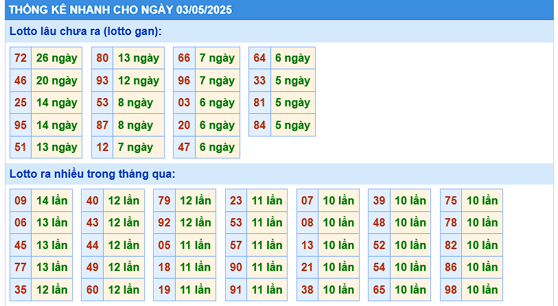 Thống kê lô tô Xổ số miền Bắc hôm nay 3/5/2025: