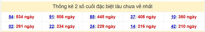 - Thống kê 2 số cuối giải đặc biệt lâu chưa xuất hiện nhất: 54 (534 lần), 91 (506 lần), 85 (445 lần), 37 (408 lần), 10 (360 lần).