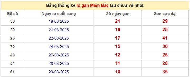- Lô gan miền Bắc lâu chưa xuất hiện: 30 - 20 - 26 - 70 - 38