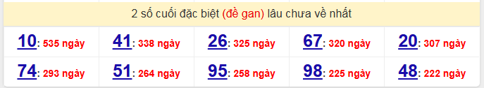 - Thống kê 2 số cuối giải đặc biệt lâu chưa xuất hiện nhất: 10 (55 lần), 41 (338 lần), 26 (325 lần), 67 (320 lần), 20 (307 lần)