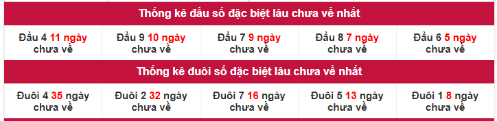 - Thống kê đuôi giải đặc biệt MB lâu chưa ra: Đầu 4: 35 ngày, Đầu 2 : 32 ngày, Đầu 7: 16 ngày, Đầu 5: 13 ngày, Đầu 1: 8 ngày