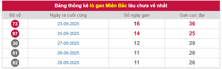 - Lô gan miền Bắc lâu chưa xuất hiện: 73 - 97 - 30 - 51 - 82