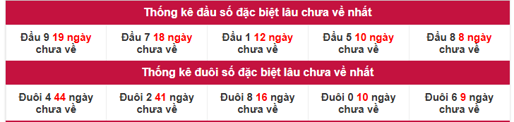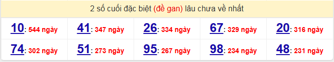 - Thống kê 2 số cuối giải đặc biệt lâu chưa xuất hiện nhất: 10 (544 lần), 41 (347 lần), 26 (334 lần), 67 (329 lần), 20 (316 lần)
