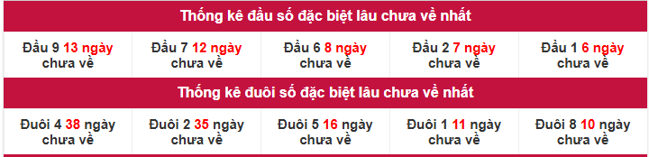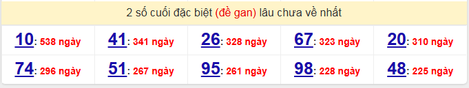 - Thống kê 2 số cuối giải đặc biệt lâu chưa xuất hiện nhất: 10 (538 lần), 41 (341 lần), 26 (328 lần), 67 (323 lần), 20 (310 lần)