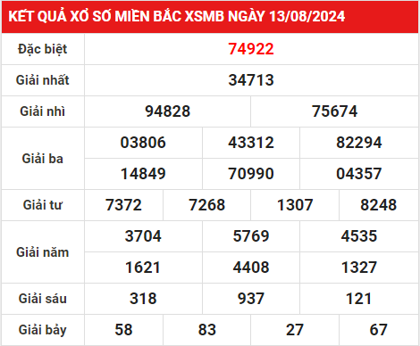 14/08/2024 08:01 - Xem(1455)Thống kê KQXS miền Bắc ngày 14/8/2024 - Tham khảo Kết quả xổ số miền Bắc ngày 14/8/2024 siêu chính xác, được thực hiện bởi các chuyên gia có kinh nghiệm, dựa trên phân tích kết quả trước đó và thống kê lô tô. Hãy tham khảo các cặp số đẹp hôm nay với bộ số bạch thủ đặc biệt nhất để có cơ hội trúng lớn.