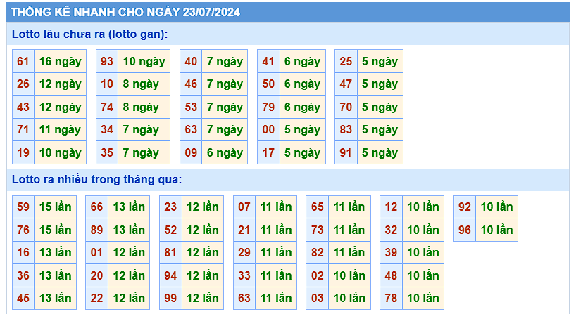 Nhận định Kết quả xổ số miền Bắc 23/7/2024 - Thống kê số liệu SXMB siêu chính xác vào lúc 18h15 ngày 23/7/2024. Có nhiều phương pháp thống kê XSMB khác nhau được áp dụng, chẳng hạn như:Thống kê lô tô gan, thống kê đặc biệt, số về kép lệch, để đưa ra những cặp số đẹp cho bảng đặc biệt cho ngày mai, số đẹp nhất hôm nay có thể về, giúp người chơi tham khảo và lựa chọn chính xác nhất.
