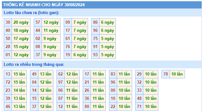 Thống kê miền Bắc ngày 30/8/2024 chi tiết nhất bao gồm: Thống kê kết quả hàng tuần, tần suất các cặp lô tô thường về, lô gan, tổng đặc biệt, và 2 số cuối giải đặc biệt trong 7 ngày liên tục, giúp bạn tìm ra cặp lô đẹp nhất.