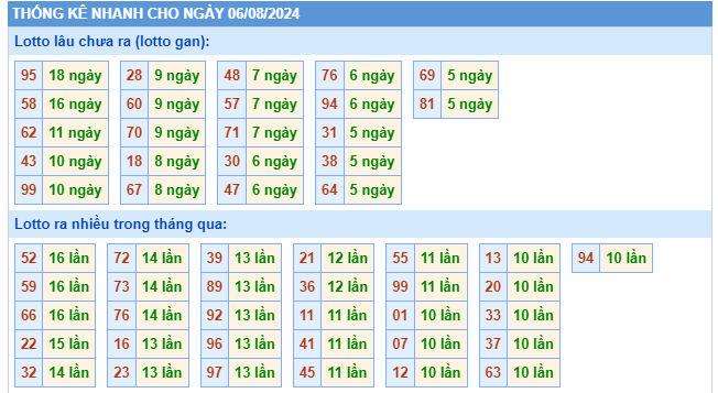 06/08/2024 08:02 - Xem(1508)Thống kê XSMB ngày 6/8/2024 - Tham khảo XSTD ngày 6/8/2024 siêu chính xác, được thực hiện bởi các chuyên gia có kinh nghiệm, dựa trên phân tích kết quả trước đó và thống kê lô tô. Hãy tham khảo các cặp số đẹp hôm nay với bộ số bạch thủ đặc biệt nhất để có cơ hội trúng lớn.