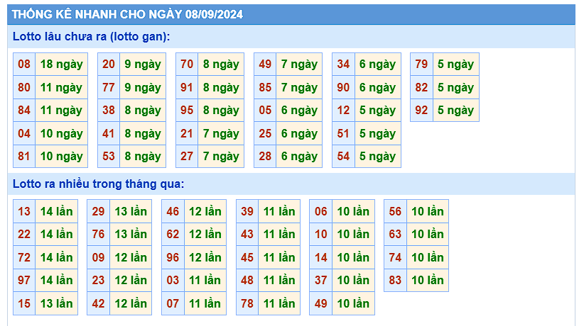 Thống kê miền Bắc ngày 8/9/2024 chi tiết nhất bao gồm: Thống kê kết quả hàng tuần, tần suất các cặp lô tô thường về, lô gan, tổng đặc biệt, và 2 số cuối giải đặc biệt trong 7 ngày liên tục, giúp bạn tìm ra cặp lô đẹp nhất.